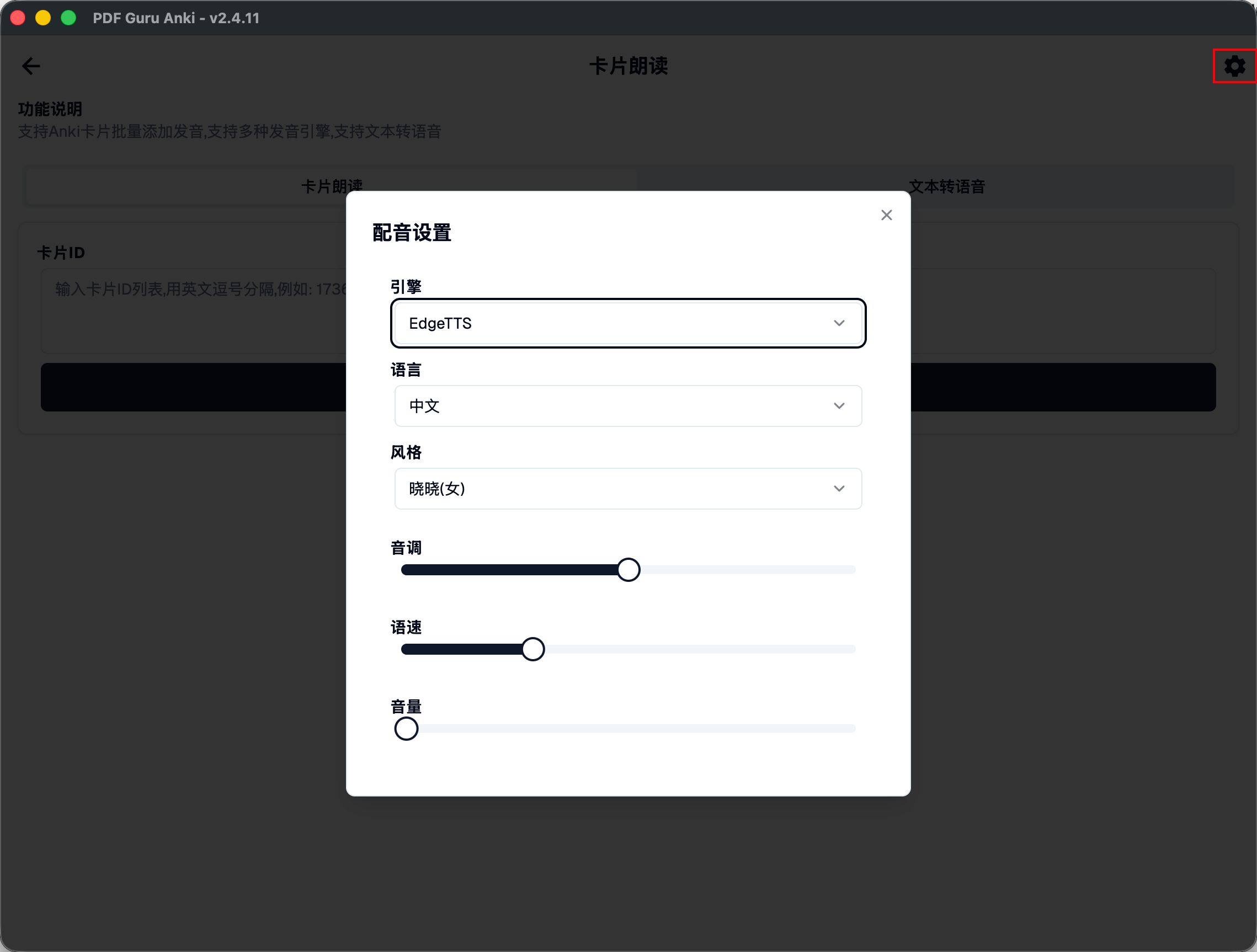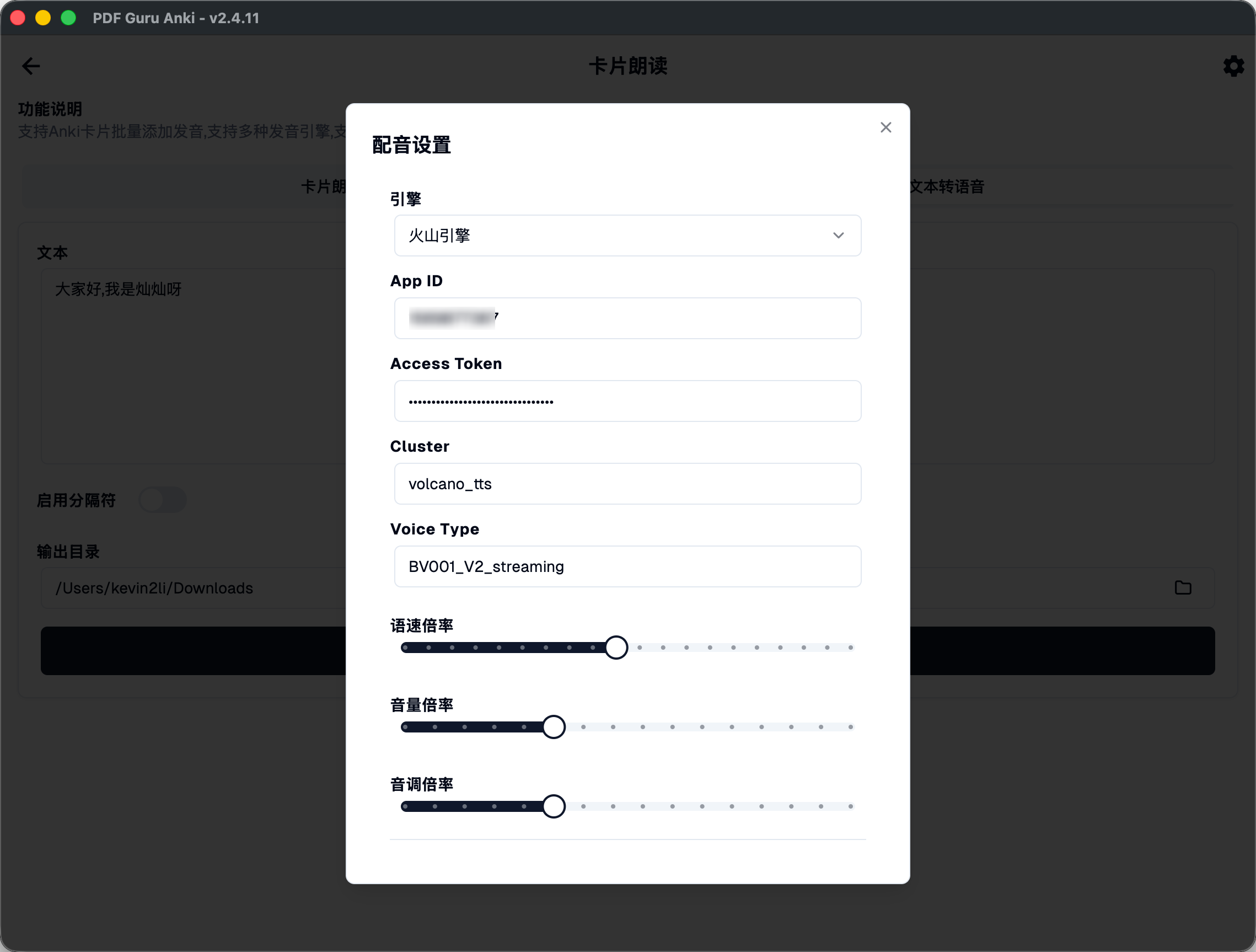 然后回到PDF Guru Anki中,在配音设置中填写上面的获取的参数即可。