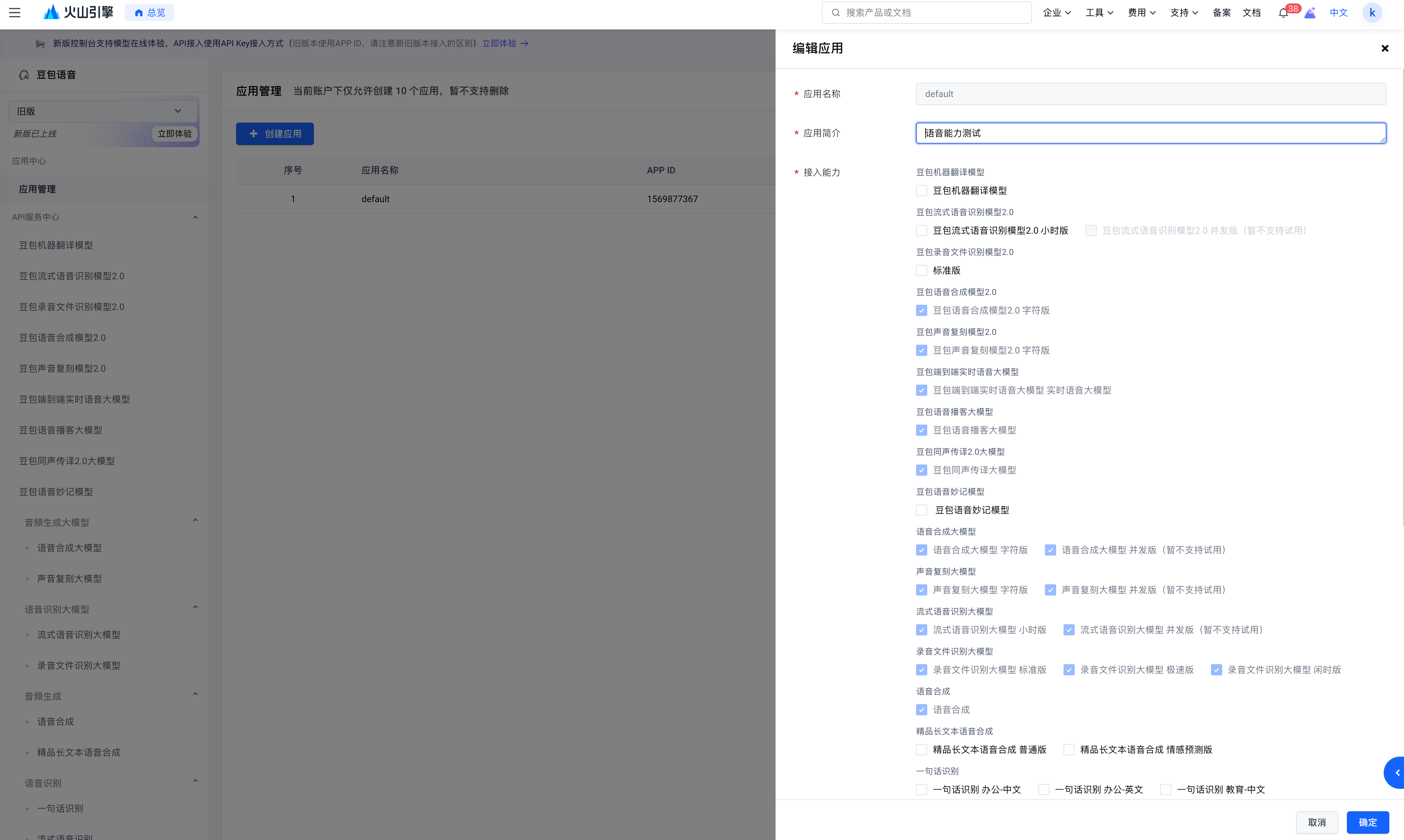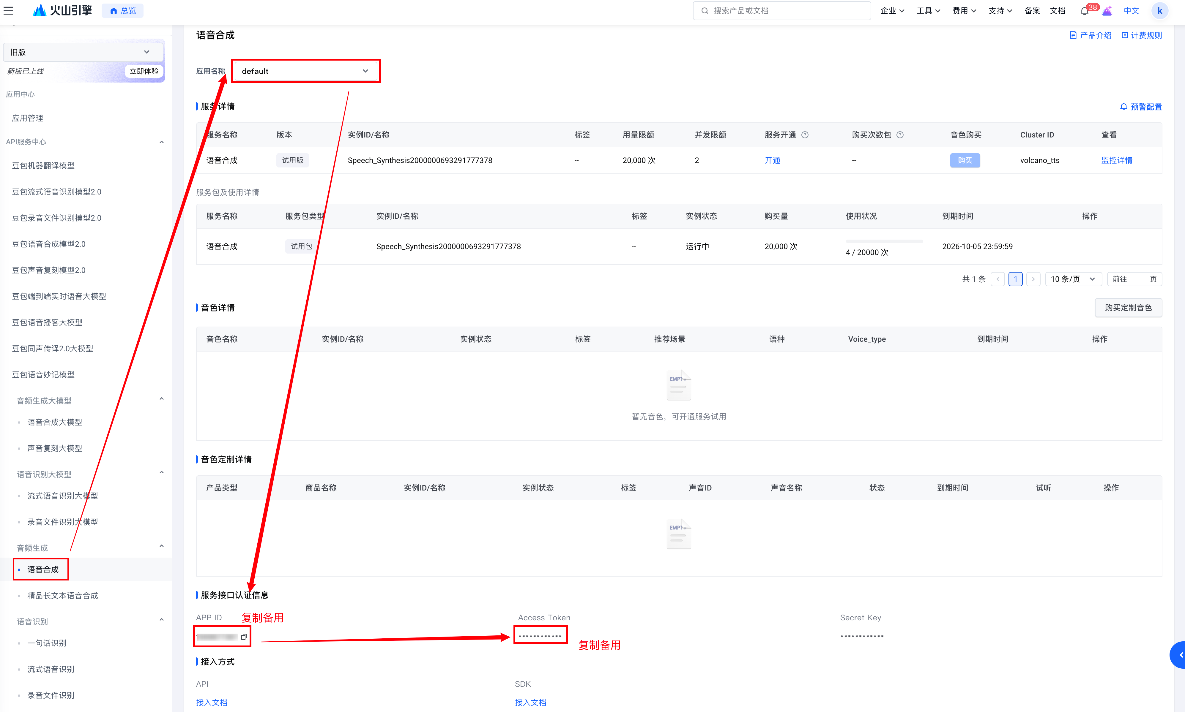 进入语音合成板块,复制APP ID、Access Token参数备用。