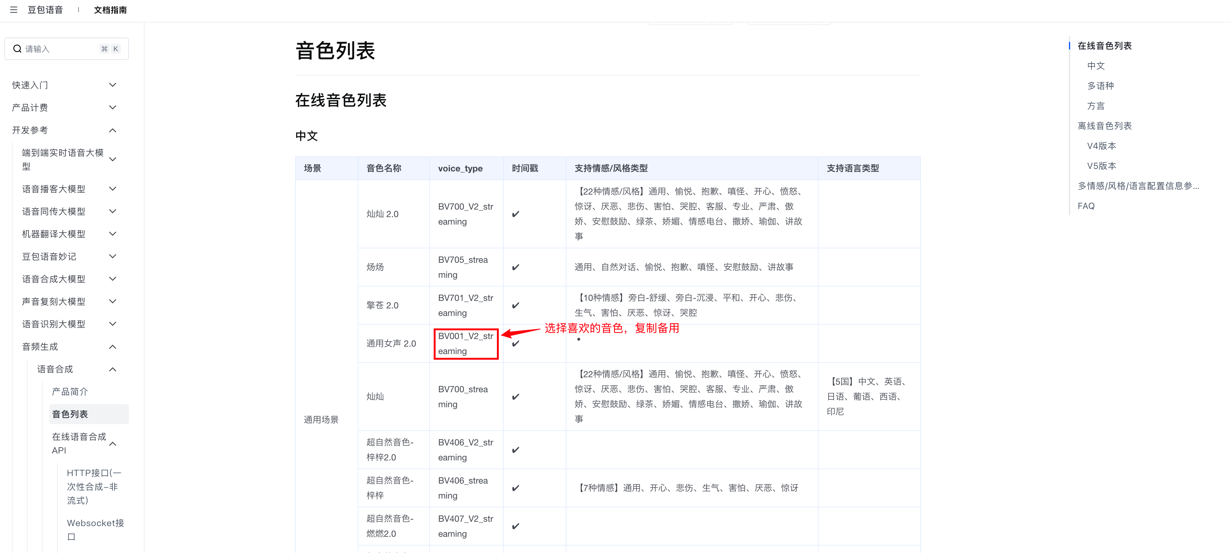 在音色列表中查找想要使用的音色,复制voice_type名称备用。