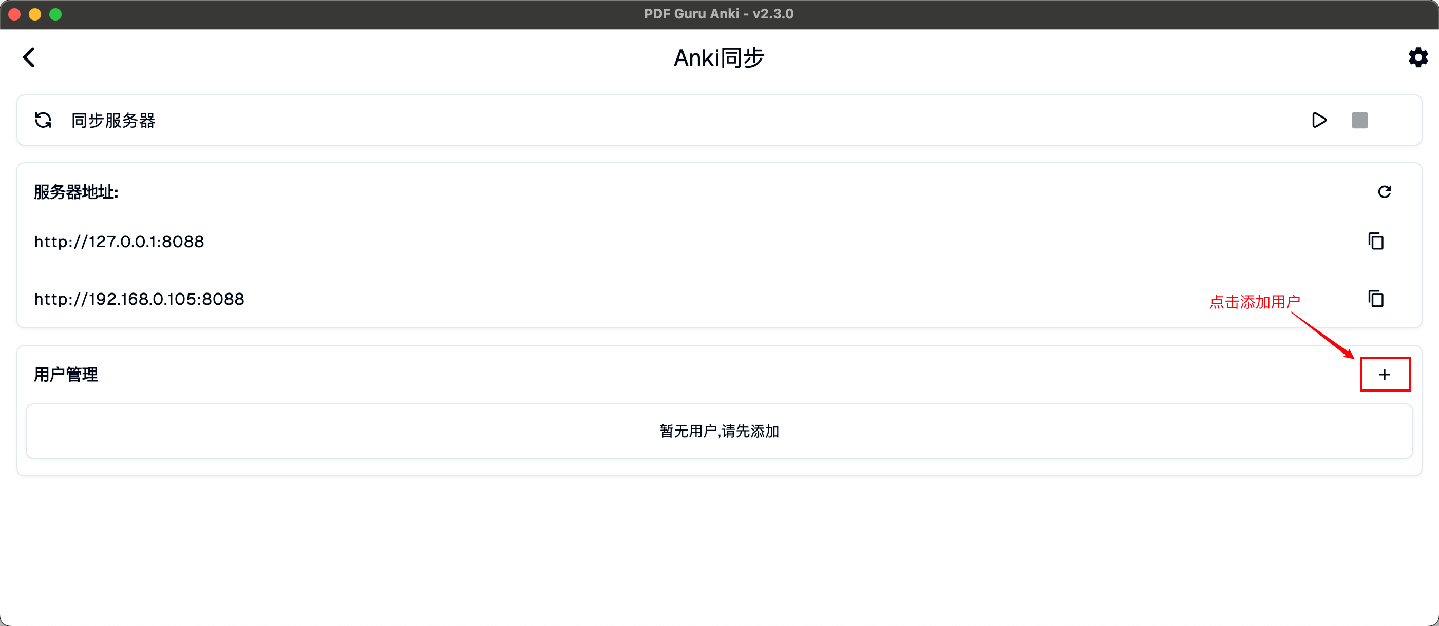 首先,在电脑上打开本软件,切换到『Anki同步』菜单,点击加号添加用户。