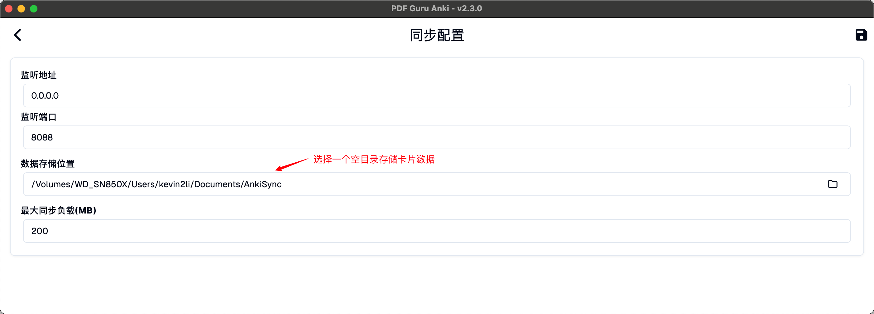 • 数据存储位置:Anki同步数据存储的路径,指定一个空目录填写即可