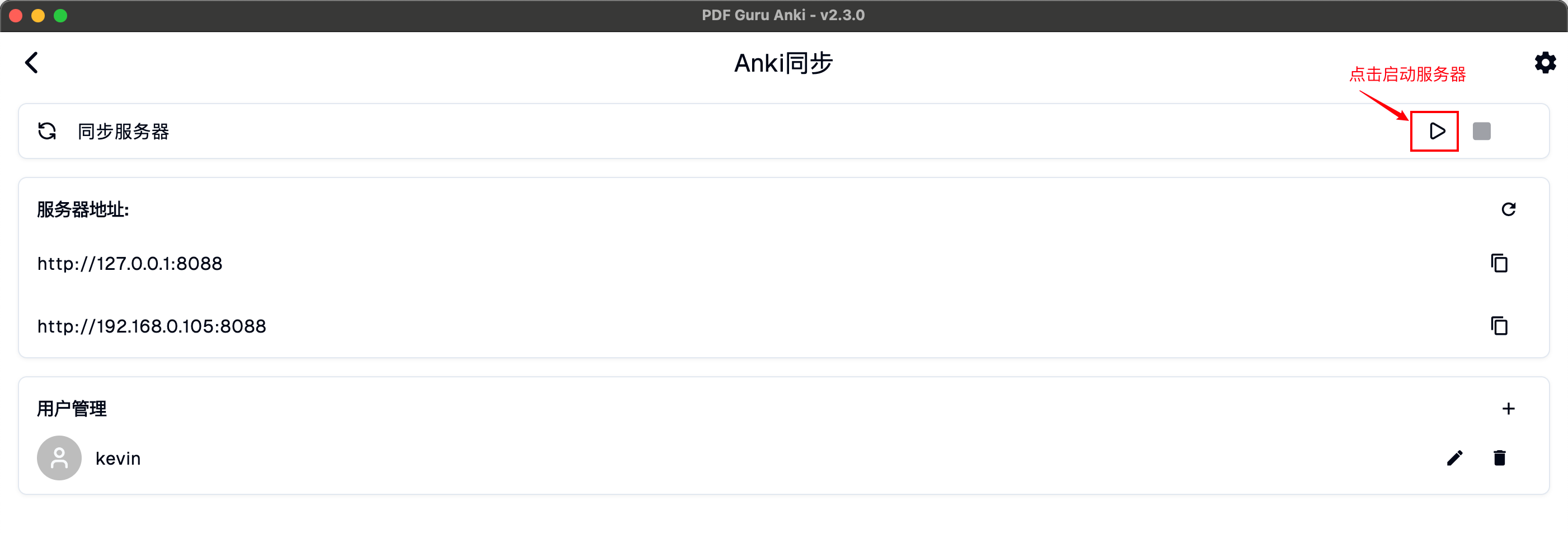 回到Anki同步主页,点击『启动』按钮,即可启动同步服务器。